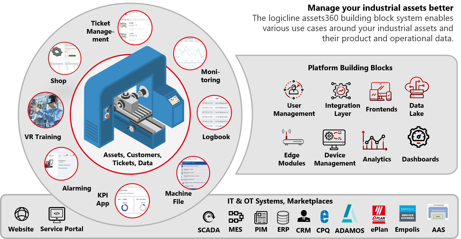 - Integrate with other modules such as virtual training, remote service, spare parts shop, analytics, etc.